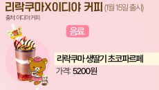리락쿠마X이디야 커피 (1월 15일 출시) ◇음료 · 리락쿠마 생딸기 초코파르페 5200원 · 코리락쿠마 생딸기 밀크 파르페- 2026-01-14 16:28