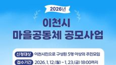 이천시(시장 김경희)는 주민이 직접 제안하고 실행하는 공동체 활동을 지원하기 위해 '2026년 이천시 마을공동체 공모사업' 참- 23시간전
