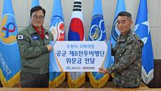 아시아투데이 송의주 기자 = 우원식 국회의장(왼쪽)이 14일 강원도 원주시 제8전투비행단을 위문 방문, 이긍규 8전투비행단장에- 23시간전