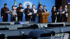 (서울=뉴스1) 김도우 기자 = 국민의힘 당내모임인 대안과미래 의원들이 14일 서울 여의도 국회 소통관에서 윤리위의 한동훈 전- 6시간전