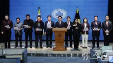 (서울=뉴스1) 김도우 기자 = 국민의힘 당내모임인 대안과미래 의원들이 14일 서울 여의도 국회 소통관에서 윤리위의 한동훈 전- 6시간전