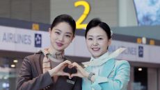 14日,在仁川国际机场第二航站楼, 韩亚航空和大韩航空的员工们为纪念韩亚航空迁入第二航站楼而拍摄纪念照。 洪金香 记者 lilachyang- 15시간전