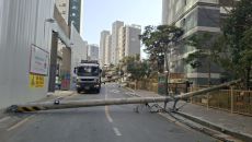 부산서 25톤 카고트럭 후진하다 전신주 2개 충격…인명피해 없어