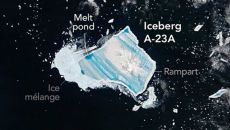 남극 빙산에 파란색 물 웅덩이가 생겼다. 미국항공우주국(나사) 지구관측소가 1986년 남극 필히너빙붕에서 떨어져 나온 빙산 A- 1시간전