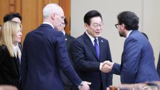 이탈리아 수행원들과 인사하는 이재명 대통령