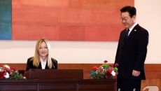 멜로니 伊총리 방명록 작성 보는 이재명 대통령