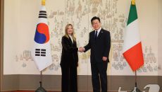멜로니 伊총리와 악수하는 이재명 대통령