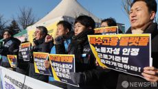 [서울=뉴스핌] 이형석 기자 = 전국민주노동조합총연맹이 21일 오전 서울 여의도 국회 앞에서 '근로기준법 개정으로 특수고용·플- 9시간전