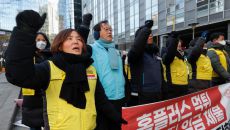 [서울=뉴스핌] 류기찬 기자 = 민주노총 서비스연맹이 21일 오전 서울 종로구 MBK 파트너스 사무실 앞에서 ‘MBK규탄 마트- 21시간전