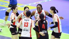페퍼저축은행 선수들이 21일 수원체육관에서 열린 2025-2026 V리그 여자부 현대건설과의 경기에서 득점을 한 뒤 함께 기뻐- 19시간전
