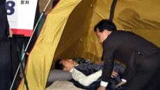 국회 로텐더홀 텐트 안에 누워있는 국민의힘 장동혁 대표를 송언석 원내대표가 살펴보고 있다./ 사진=연합뉴스 국민의힘 장동혁 대- 2026-01-22 10:40