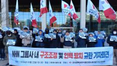 NHN 노동조합이 사측의 계열사 매각과 사업 종료를 규탄하며 고용 안정을 보장해달라고 촉구했다. 민주노총 화학섬유식품노조 NH- 2026-01-22 17:09