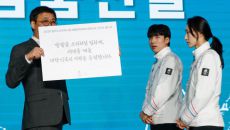 선수대표에게 격려보드 전달하는 최휘영 문체부 장관