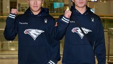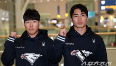 한화 이글스 선수단이 23일 인천국제공항을 통해 스프링캠프가 열리는 호주로 출국했다. 최유빈, 오재원이 포즈를 취하고 있다.- 21시간전