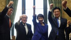 올해 첫 일본 정기국회가 열린 23일 중의원 해산이 결정된 직후 다카이치 사나에(왼쪽 세 번째) 일본 총리가 당 간부들과 함께- 23시간전