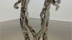 거울처럼 빛나는 인간 형상의 조각 두 점이 서로 다른 방향을 바라보며 섰다. 원래는 양팔을 벌려 서로를 끌어안고 있던 한 덩어- 2026-01-23 17:30