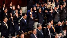 (도쿄 로이터=뉴스1) 최종일 선임기자 = 23일 일본 도쿄 국회에서 중의원(하원) 해산이 선포된 후 의원들이 손을 들어 "반- 2026-01-23 17:14
