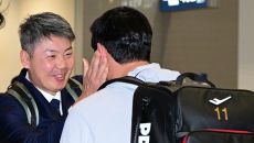 [사진]두산 김원형 감독, '출국장에서 만난 함덕주 쓰담쓰담'