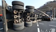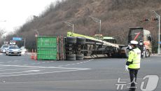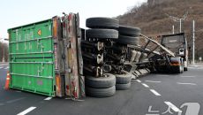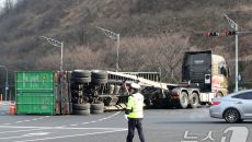 (대구=뉴스1) 공정식 기자 = 23일 오후 대구 수성구 범안삼거리 일대에서 25톤 트레일러에 실린 컨테이너가 전도돼 도로에- 2026-01-23 15:52