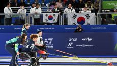 휠체어컬링 이용석(아래)이 5일(현지시간) 이탈리아 코르티나담페초 델 기아초 컬링 올림픽 스타디움에서 열린 2026 밀라노 코- 2시간전