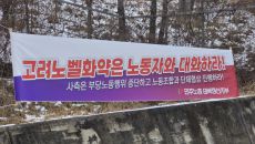강원 태백시 고려노벨화약 태백공장 정문 도로변에 6일 사측의 부당노동행위 중단·노동조합과 단체협상을 요구하는 현수막이 걸려있다- 2026-03-06 15:24