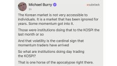 영화 '빅 쇼트' 실제 인물로 유명한 미국 공매도 투자자 마이클 버리가 현지시간 5일 코스피 급등락 사태를 두고 불길한 사태의- 20분전