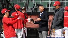 28일 인천 SSG랜더스필드에서 열린 SSG와 KIA의 경기. SSG 김재현 단장, 이숭용 감독이 대화를 나누고 있다. 인천=- 21시간전