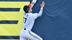 28일 잠실야구장에서 열린 KT와 LG의 개막전. 6회초 LG중견수 박해민이 KT 안현민의 타구를 잡으려다 펜스와 충돌하고 있- 21시간전