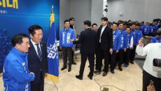 정청래(왼쪽 두 번째) 더불어민주당 대표가 25일 충북 충주시 유네스코국제무예센터에서 열린 최고위원회의 직후 파란색 점퍼를 입- 2026-03-26 00:24