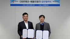 윤철주 CJ대한통운 본부장(왼쪽)이 지난 26일 서울 종로 CJ대한통운 본사에서 열린 협약식에서 신소봉 메를로랩 대표와 기념- 2026-03-29 11:48