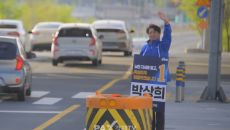 박상희 기장군의원 예비후보가 정관 일대 도로변에서 출근 시간대 차량 운전자들에게 인사하며 지지를 호소하고 있다. [사진=박자연- 2026-04-19 20:47