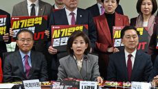 아시아투데이 송의주 기자 = 나경원 의원을 비롯한 국민의힘 의원들이 31일 국회 의원회관에서 열린 '헌재의 신속 탄핵 각하·기- 2025-03-31 11:26