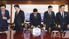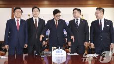 (서울=뉴스1) 이광호 기자 = 우원식 국회의장(가운데)과 권성동 국민의힘 원내대표(왼쪽 두 번째), 박찬대 더불어민주당 원내- 2025-03-31 11:15