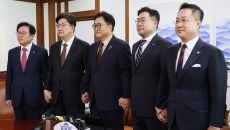 (서울=뉴스1) 이광호 기자 = 우원식 국회의장(가운데)과 권성동 국민의힘 원내대표(왼쪽 두 번째), 박찬대 더불어민주당 원내- 2025-03-31 11:15