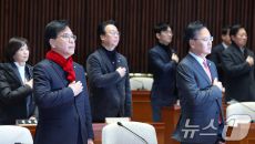 (서울=뉴스1) 신웅수 기자 = 송언석 국민의힘 원내대표가 21일 서울 여의도 국회에서 열린 긴급 의원총회에서 국민의례를 하고- 2026-01-21 14:23