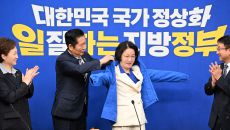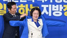 추미애에게 파란 점퍼 입혀주는 정청래 "민주당 상징이자 전략 자산" [TF사진관]