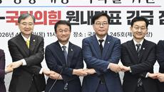16일 국회에서 열린 ‘중동 상황 대응·극복 위한 원내대표 긴급 점검 회의’에서 주요 참석자들이 손을 맞잡은 채 기념사진을 촬- 2026-04-16 23:59