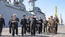 (서울=연합뉴스) 김호준 이은정 기자 = 김정은 북한 국무위원장이 취역을 앞둔 5천t급 신형 구축함 '최현호'에서 진행된 미사- 2시간전