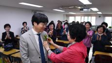 스승의 날인 15일 서울 마포구 일성여자고등학교 1학년 2반에서 학생이 고형구 담임선생님에게 꽃을 달아 드리고 있다. 저작권자- 2025-05-15 15:34