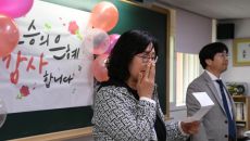 스승의 날인 15일 서울 마포구 일성여자고등학교 1학년 2반에서 고형구 담임선생님이 '스승의 은혜' 를 듣고 눈물흘리고 있다.- 2025-05-15 15:34