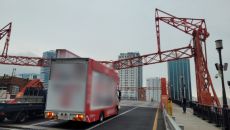 부산 영도대교에서 선거유세차 높이제한 시설물 들이받아