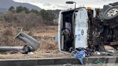 제주 평화로서 대형 화물차 전도 사고…70대 운전자 사망