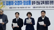 [광주=뉴시스]맹대환 기자 = 광주민주진보시민교육감후보 단일화에 참여하고 있는 예비후보 3명이 광주·전남 교육통합은 행정통합과- 5시간전
