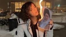 히잡을 착용하지 않고 곱슬머리를 드러낸 여성이 라이터를 켜서 이란의 최고지도자 아야톨라 알리 하메네이의 사진에 불을 붙인다.- 48분전
