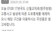 충북 진천군 신월교차로 도로통제가 해제됐다. 진천군은 20일 오전 7시 49분께 "오늘 오전 7시 17번 국도 신월교차로(청주- 14시간전