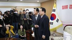 (대전=뉴스1) = 이장우 대전시장과 김태흠 충남도지사가 21일 대전시청 접견실에서 대전·충남 행정통합 관련 긴급 회동에서 악- 5시간전