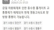 동수원 톨게이트 교통통제가 해제됐다. 수원특례시는 23일 "금일 차량화재로 인한 동수원 톨게이트 교통 통제가 해제됐다"는 내용- 22시간전