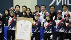 쇼트트랙 선수들과 기념촬영하는 민주당 지도부