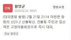 경상남도 함양군 마천면에서 발생한 산불로 인해 대피 명령이 내려졌다. 22일 함양군은 안전재난문자를 통해 "지난 21일 오후- 2시간전