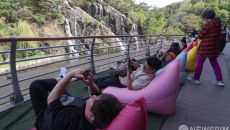 폭포 앞에서 식히는 초여름 더위
